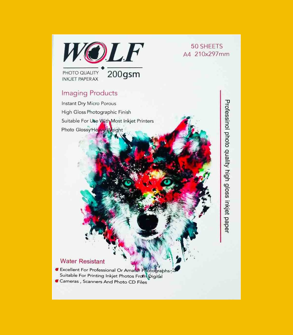 کاغذ فتو گلاسه 200 گرم ولف (wolf)؛ سایز A4 در بسته بندی های 50 عددی ، قابل استفاده در دستگاه های جوهرافشان می باشد. فتوگلاسه 200 گرم ولف با کیفیت بسیار بالا تری در مقایسه با دیگر کاغذهای هم ردیف خود می باشد و ضخامت بالایی دارد و همچنین دارای رویه براق می باشد که مناسب برای چاپ عکس، بدون پخش شدن جوهر می باشد. از کاغذ فتوگلاسه 200 گرم ولف می توان در عکاسی ها، کافی نت ها، آموزشگاه ها، مدارس و مراکز دیگر برای چاپ عکس و کاتالوگ و بروشور استفاده نمود. عکس های حرفه ای چاپ شده توسط کاغذ فتو گلاسه 200 گرم ولف سایز A4 از کیفیت و وضوح ۴۸۸۰ برخودار است. از این رو تمامی عکس هایی که بر روی این نوع کاغذ گلاسه چاپ می شود از کیفیت بسیار بالایی بهره می برند. این نوع کاغذ نسبت به رطوبت دست و رطوبت محیط از مقاومت بسیار بالایی برخوردار است. این خصوصیت ماندگاری بالایی را به دنبال دارد. در نتیجه طول عمر مفید محصول به شکل قابل توجهی افزایش خواهد یافت. همچنین وجود لایه محافظ در این نوع کاغذ فتو گلاسه درخشندگی فوق العاده ای را به کار می بخشد.